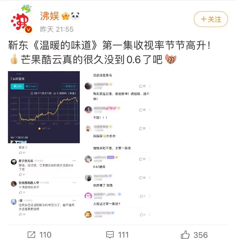 近期於市場中播出的一部獻禮扶貧題材《温暖的味道》,收視率達到0.6%。如若將其放置在過往、甚至更早之前的收視數據中,這樣的收視成績堪稱跌破芒果台收視,但卻成為了近期靳東粉絲口中的“第一集收視率節節高”、“芒果酷雲很久沒到0.6了。”