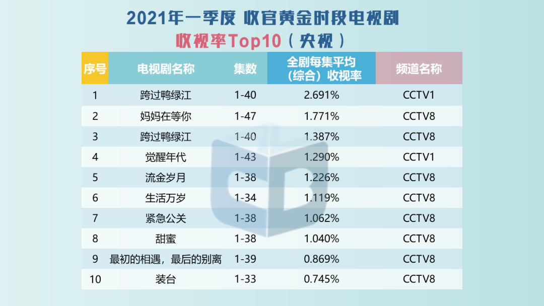 從作品題材來看,今年前四個月,劇集市場佔據收視主導的,以獻禮題材為主,如《跨過鴨綠江》以破2收視率登頂、《媽媽在等你》以1.77%的收視率登錄亞軍榜單,《山海情》則以1.504%的收視率次之。據統計,今年前4月收視榜單中,破1獻禮劇作品數量為5部,佔據總量近1/3。