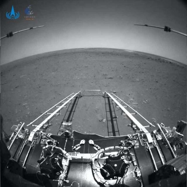 中國青年報客户端訊(中青報·中青網記者 邱晨輝)2021年5月19日,國家航天局發佈我國首次火星探測天問一號任務探測器着陸過程兩器分離和着陸後火星車拍攝的影像。圖像中,着陸平台和“祝融號”火星車的駛離坡道、太陽翼、天線等機構展開正常到位。