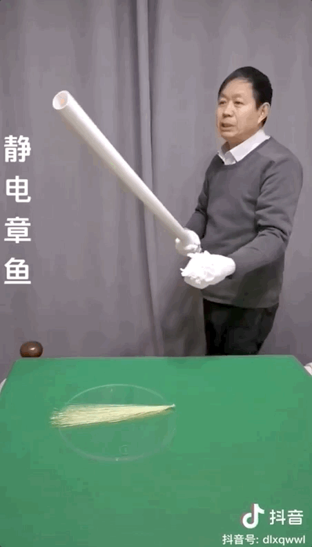 另一個著名的實驗是“靜電章魚”。視頻中,這隻被劉教授製作出來的“靜電章魚”,只需用毛巾摩擦,通過同性電荷相排斥的原理,就能在空中漂浮起來,簡單又好玩。