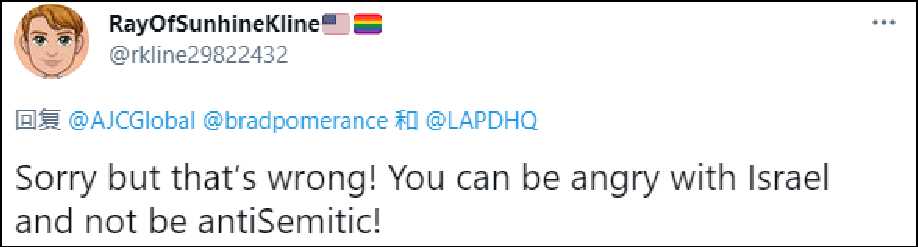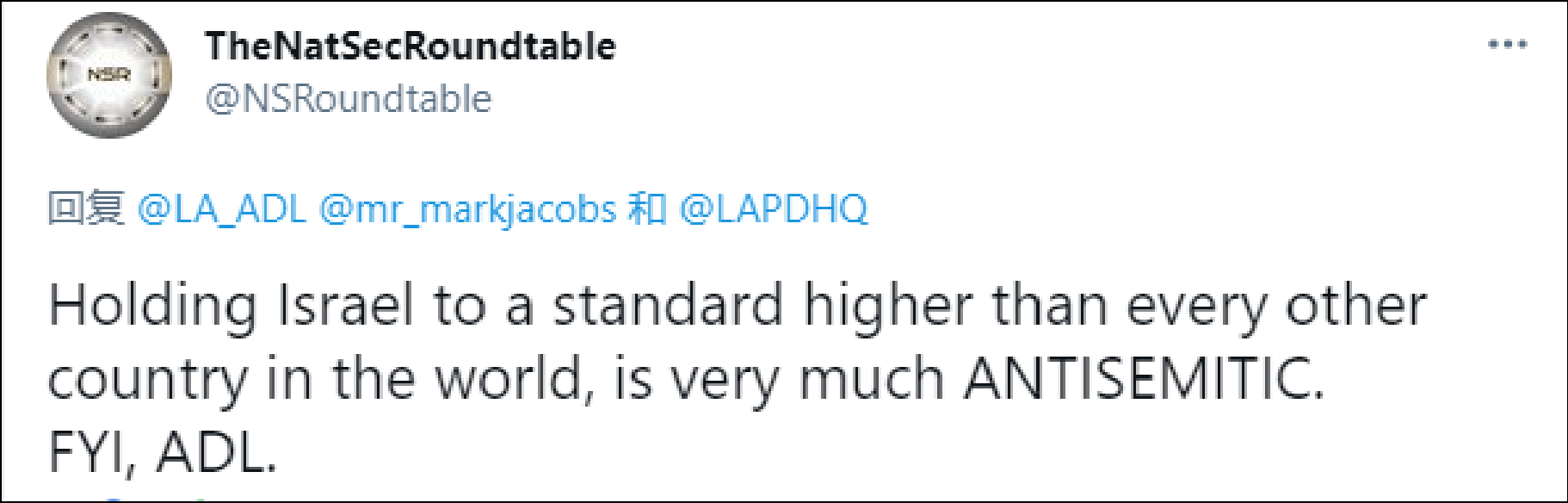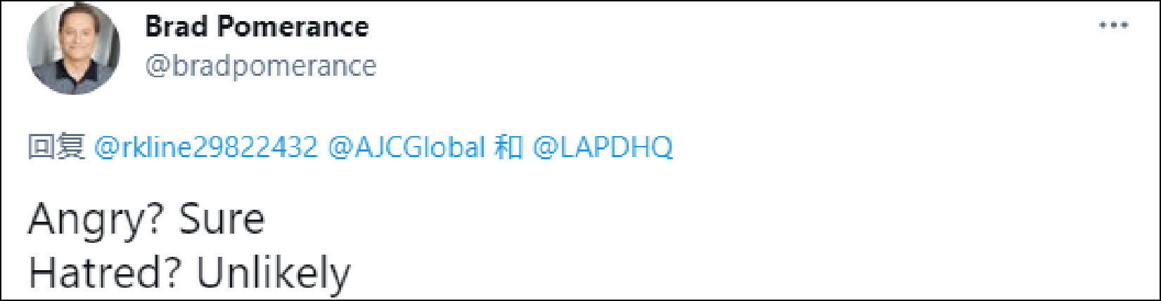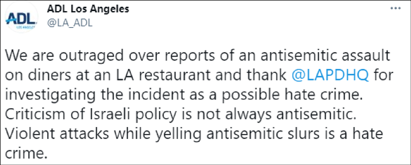 “我們對發生在洛杉磯一家餐廳的一起反猶主義者襲擊顧客的事件感到憤怒,感謝洛杉磯警方(LAPD)將此事定性為‘仇恨犯罪’。對以色列政策的批評並不一定屬於反猶主義,但暴力襲擊並高喊‘反猶髒話’的行為是一種仇恨犯罪。”