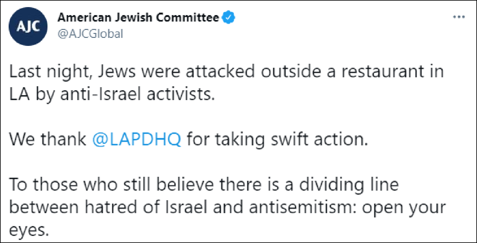 “昨晚,猶太人在洛杉磯一家餐館外被反以色列活動人士襲擊。我們感謝洛杉磯警方(LAPD)的迅速行動。對於那些仍然認為仇恨以色列和反猶主義之間有區別的人們:睜大你們的眼睛好好看看吧。”