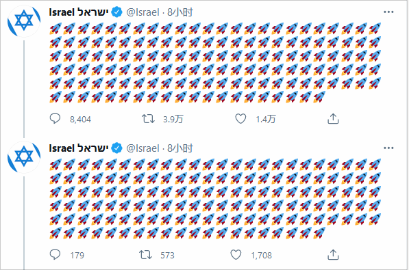 當地時間5月17日晚間,以色列官方推特號@Israel 連發12條推文,每條內容都只有推特自帶的“火箭”表情符號。前11條推文每條140枚“火箭”,第12條推文有80枚“火箭”,共計1620枚。