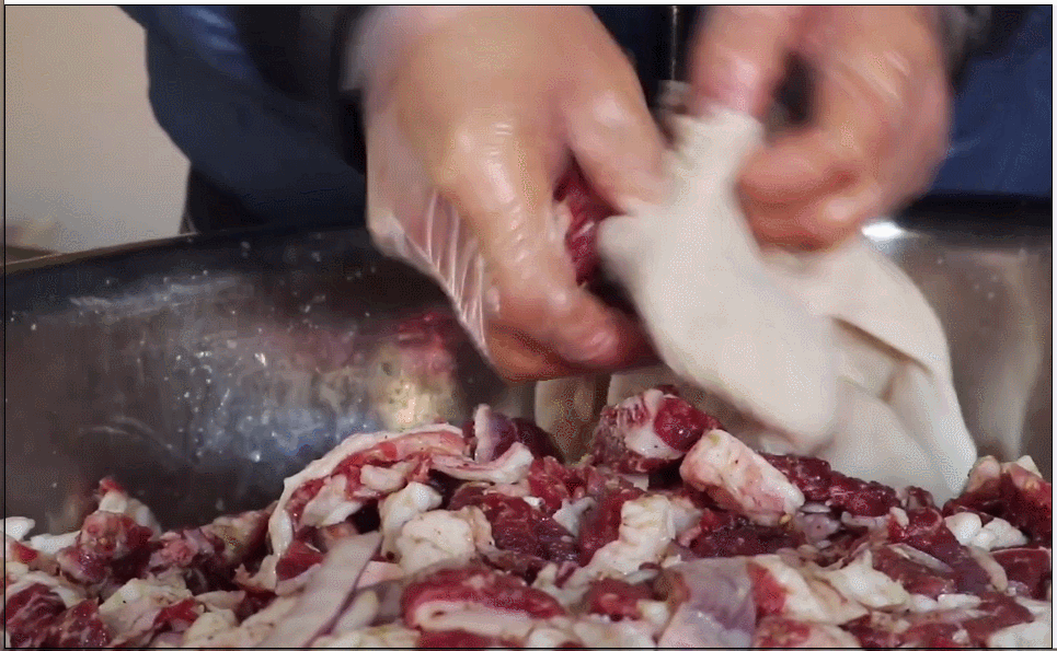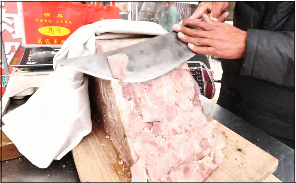 煮好的羊肉,剔去膘油,羊肉塊逐個放在案板上碼放整齊,用細白棉布裹起後,擠壓,將水分擠去成為坨型,放入冷倉凝固,儲存12小時以上,即可用以切片上桌。