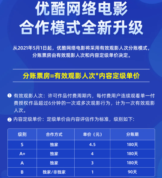 或許是為了緩解這一狀況,4月份優酷對網絡電影分賬規則進行了全面升級,取消了之前“有效觀影時長”的衡量維度,採取了跟愛奇藝一樣的“有效觀影人次”,並且也是以6分鐘為限。