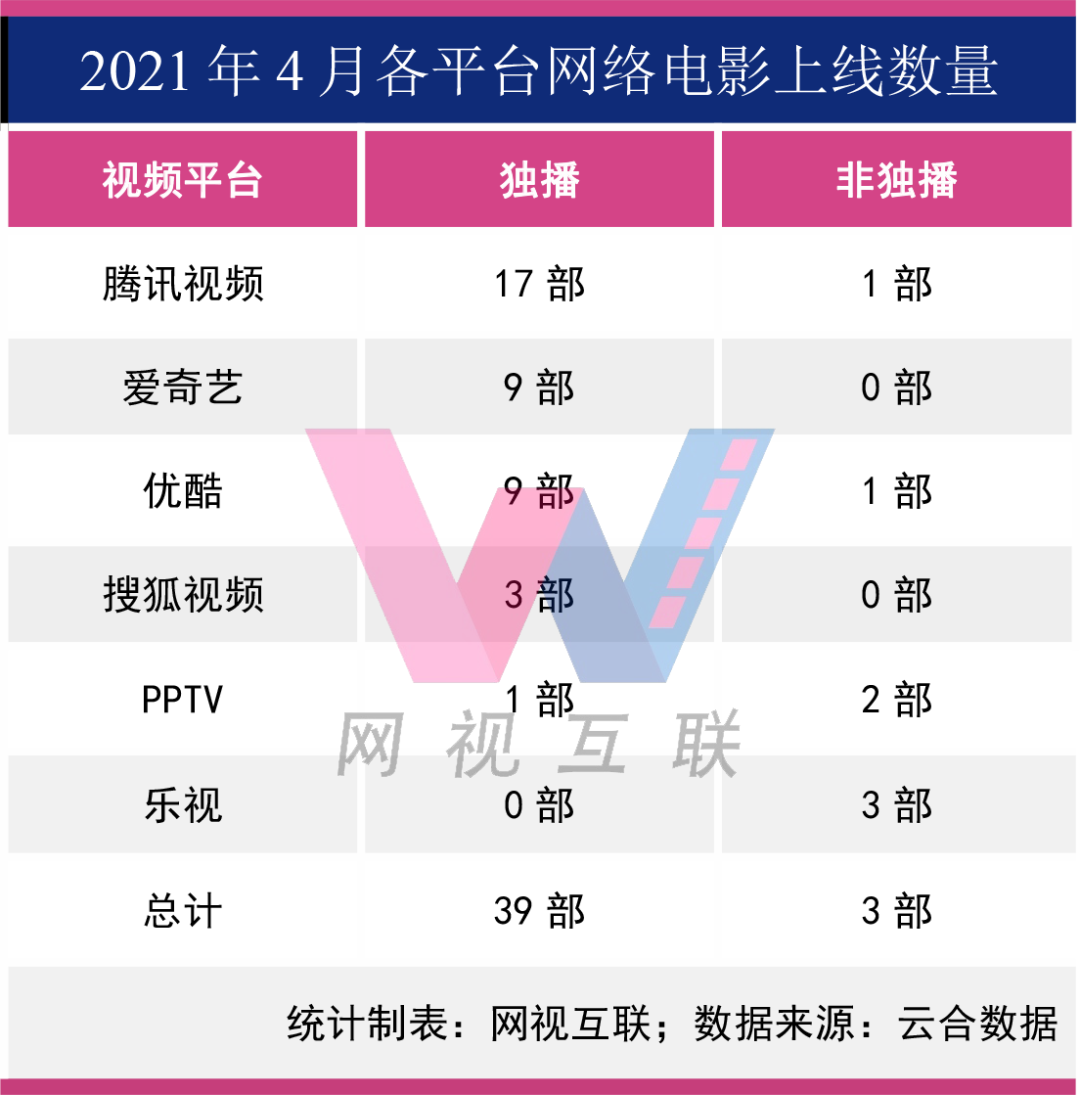 在39部獨播影片中,騰訊視頻17部,優酷和愛奇藝各9部,搜狐視頻3部,PPTV1部。