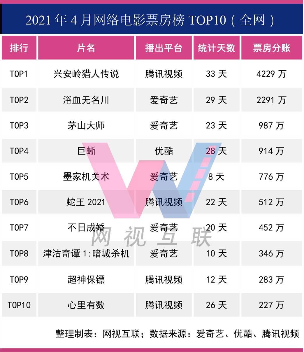 不過取得4月份片冠軍的,是騰訊視頻獨播的《興安嶺獵人傳説》。《興安嶺獵人傳説》首月分賬4173萬,刷新行業紀錄。上線33天,票房分賬4229萬,也是目前網絡電影的年度票房冠軍,也有可能是最終的年度票房冠軍。