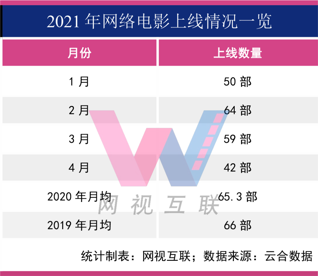 據云合數據,4月份全網上線網絡電影共42部,數量上較3月份有所減少,也遠遠低於2019和2020年的月均上線。
