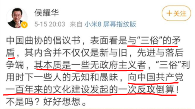 5月15日,“老藝術家”侯耀華寫了條微博,連續用“三俗”“無政府主義者”“反攻倒算”等詞,把矛頭直指郭德綱。
