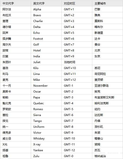 時區的無線電字母代字如下。