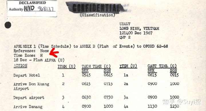 比如這份1967年美國駐南越陸軍的日程表附錄。駐越美軍主要是用西貢時間(H時,GMT+8),但因這一日程涉及從G時區(即GMT+7)的曼谷飛來,所以也附註了曼谷時間作為對照。