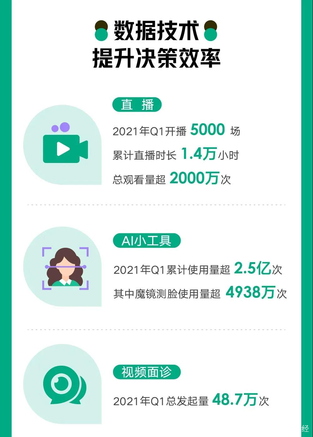以視頻面診為例,2021年一季度,新氧視頻面診發起量高達48.7萬次,單日最高發起量14729次,包括魔鏡測臉在內的新氧AI小工具,一季度使用量超過2.5億次,在這些工具支持的獨立諮詢業務支持下,視頻問診進一步幫助新氧完善了醫美轉化生態圈。