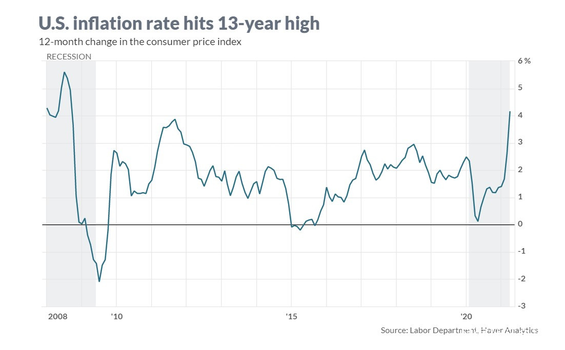 不管是什麼原因,4月份通脹達到13年來最高位,也就是2008年金融危機以來的最高位,與2020年4月相比,同比增長達到4.2%。據報道,消費市場上的商品漲價是全方位的,但美聯儲的鮑威爾堅持這是短期的,在年底之前會回到預期的2%左右,因此拒不調整利率。倒是耶倫在前幾天不那麼確定,説漏嘴了,結果引起股市暴跌,趕緊打圓場。今天通脹數據出來了,股市還是暴跌了。