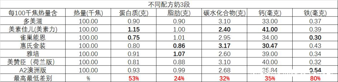 可到了3、4段奶粉,國外品牌之間的差距非常大。有研究機構檢測後發現,各家的3段奶粉,類似蛋白質等核心指標的差別能超過50%。