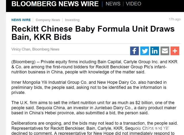 5月18日,據據彭博社和英國每日郵報的報道,美贊臣母公司利潔時集團已經確定了這個奶粉品牌中國業務出讓的競標人,伊利、凱雷資本和中信資本組合投資,君樂寶攜手的是紅杉資本,還有貝恩資本以及私募股權KKR,按照約定這幾家將在6月11日遞交競標標書。