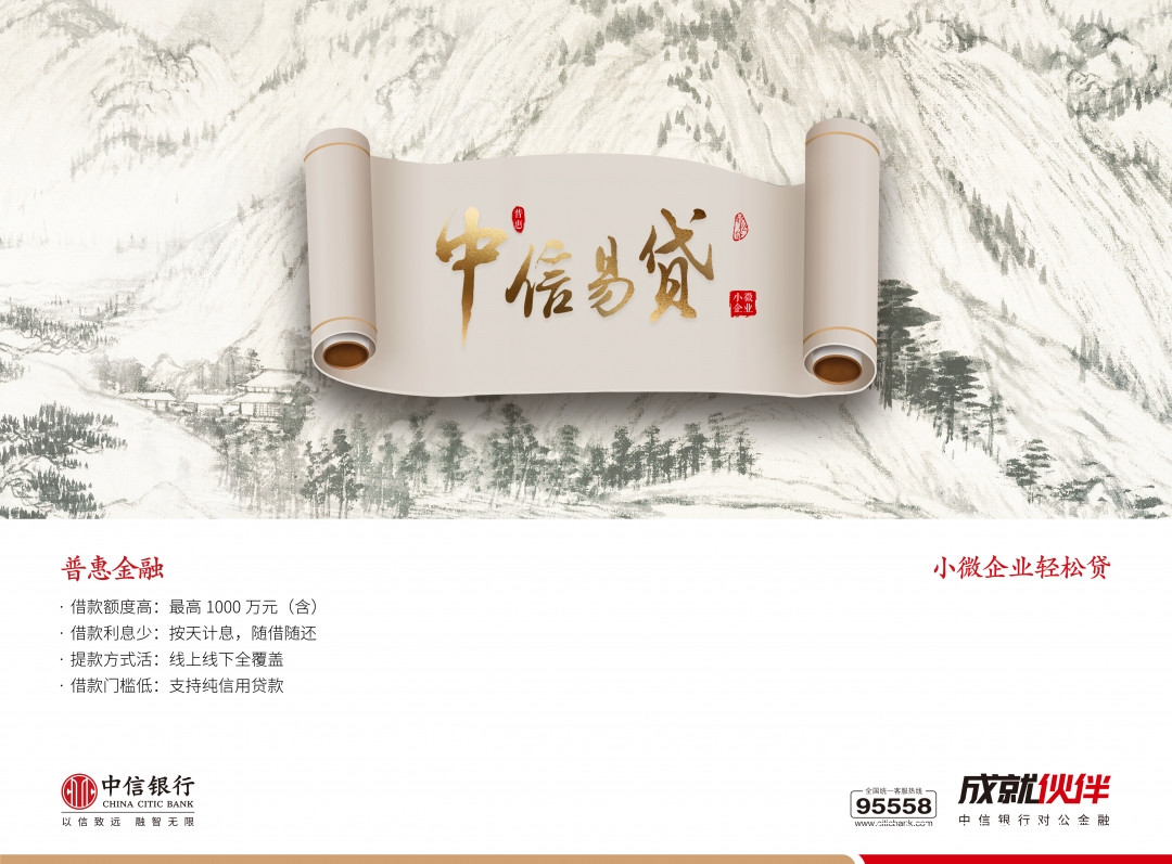 去年9月,中信銀行正式發佈了普惠金融全新品牌“中信易貸”。甲骨文中,“易”像兩隻手託着盛滿水的器皿向另一個容器倒水,形象地體現了中信銀行普惠金融用金融活水滋養小微企業的初心。現代語中,“易”釋義為輕鬆、親近、變化,代表“中信易貸”以更加便捷的方式、更加温暖的服務、更加創新的模式,為小微企業客羣提供金融服務。