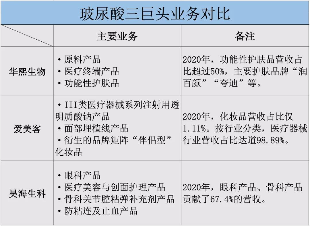 按前述所言,華熙生物將玻尿酸主要應用到醫療終端、護膚品。而與之並稱“玻尿酸三巨頭”的另外兩家——愛美客、昊海生科在玻尿酸應用場景上也是各有側重。