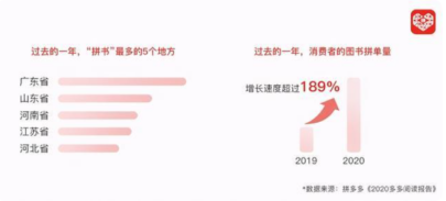 根據拼多多4月20日發佈的《2020多多閲讀報告》,2020年,消費者在拼多多上的圖書訂單量增速超過189%,新疆、西藏等大西北地區拼單增速最快。