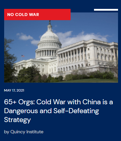 昆西研究所在其網站上的聲明進一步指出,與中國的冷戰是一種危險的、自欺欺人的戰略,這將導致美國在經濟不平等、氣候變化、流行病等全球問題上失去同中國合作的機會。