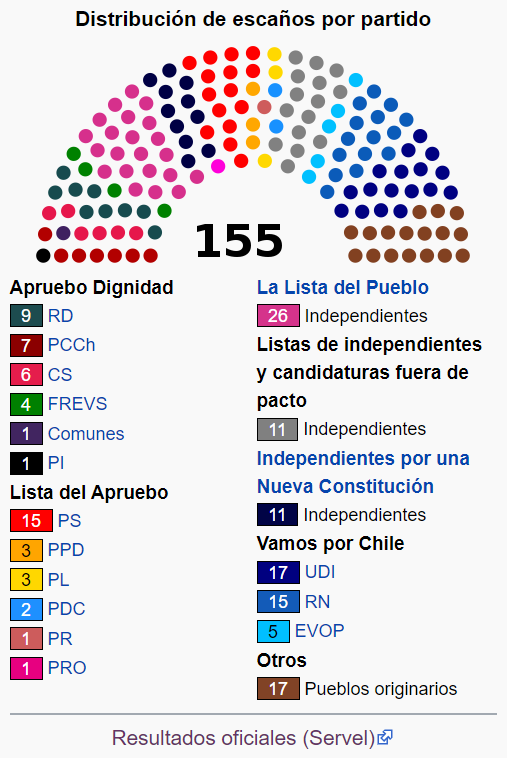 最終的選舉結果表明,新的立憲會議由77位女性代表和78位男性代表組成,這甚至還是配額調整後的結果,而傳統黨團遭遇歷史性慘敗:後皮諾切特時代輪流執政智利的左右兩派,加到一起僅獲得了155席中的62個,其中皮涅拉所屬政黨UDI僅獲17席,除非有奇蹟能夠幫助皮涅拉重建聯合三分之二會議席位的新黨團聯盟——這至少意味着除獨立代表外的所有人——未來全面失去立憲議程控制權已成定局。