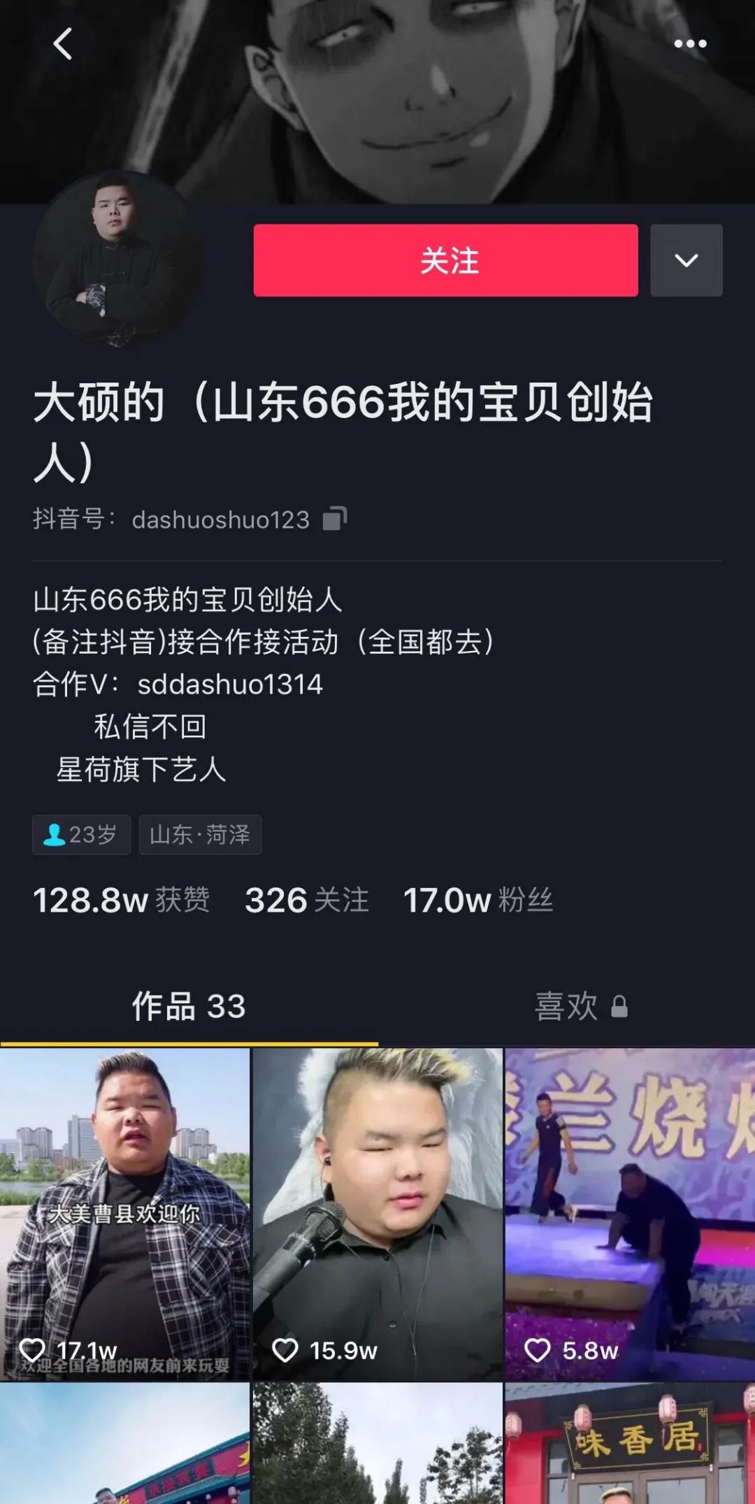 在停不下來的“曹縣”再創作中,沒有人注意到,抖音博主“大碩的”已默默在名字後面加上了“山東666我的寶貝創始人”,搖身一變“星荷旗下藝人”,並在簡介中表示“接合作接活動,全國都去”。
