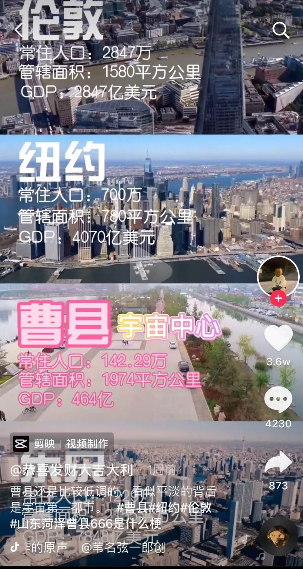抖音博主調侃曹縣是“宇宙中心” 來源 / 抖音截圖