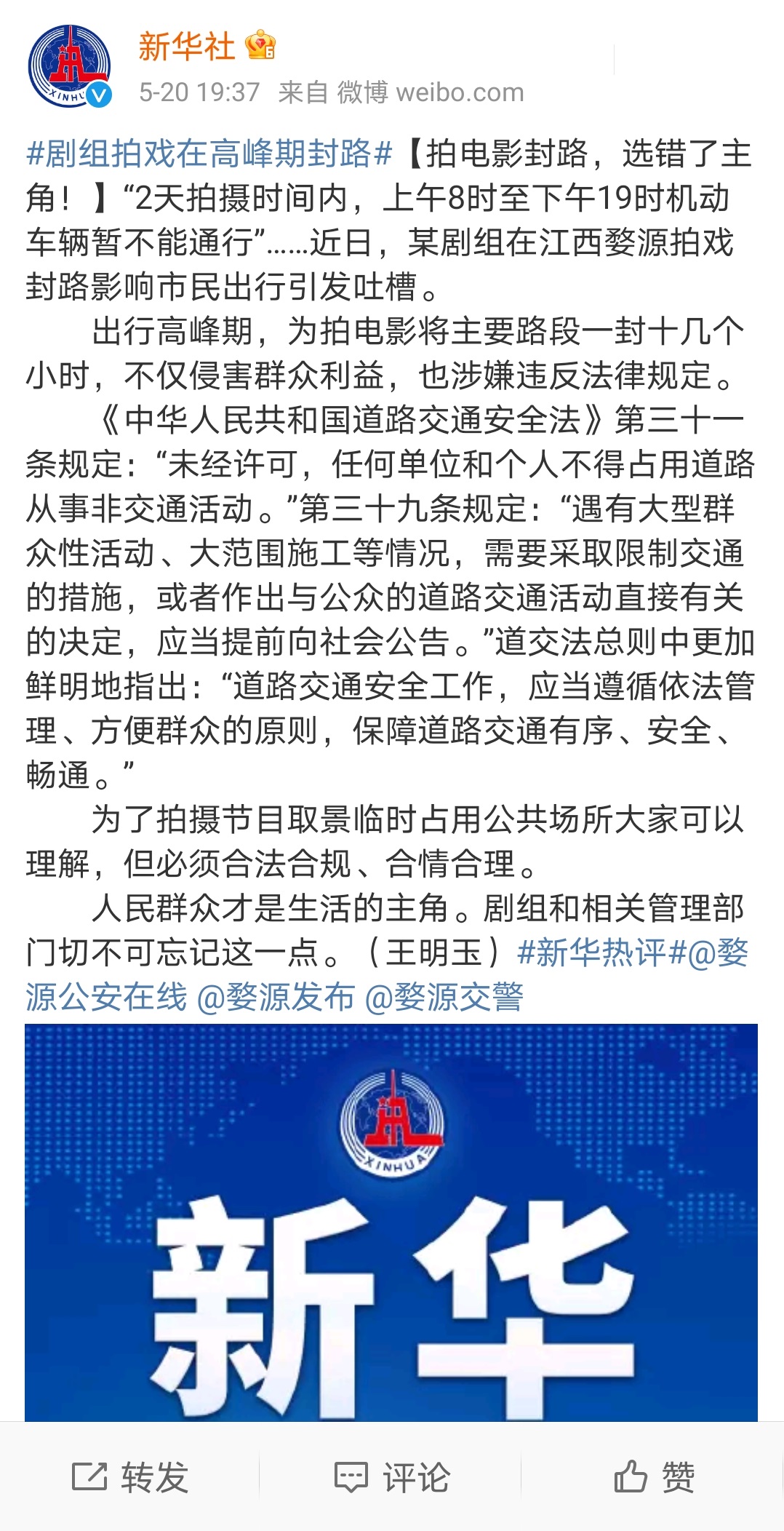出行高峯期,為拍電影將主要路段一封十幾個小時,不僅侵害羣眾利益,也涉嫌違反法律規定。
