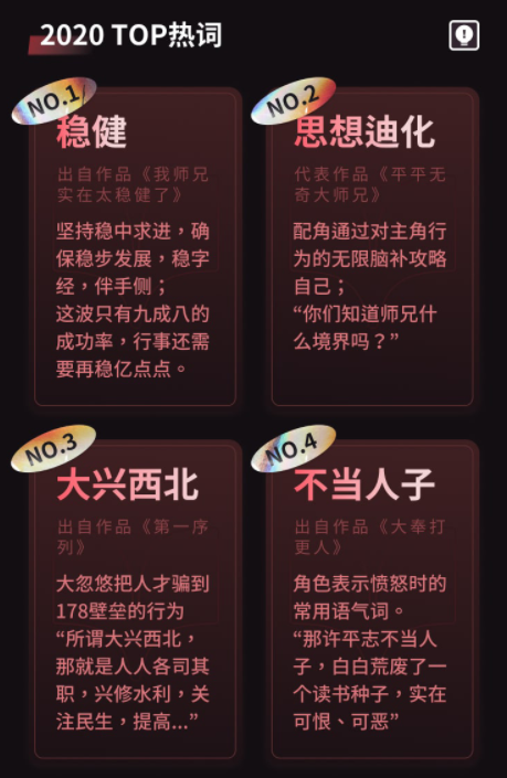 一個很好的説明是,在年輕創作者的帶動下,“網文梗”成為網絡文學反映文化趨勢和引領傳播潮流最顯性的內容表達。起點2020年度TOP熱詞中,“穩健”、“思想迪化”、“大興西北”等“梗”都得到了眾多書粉的傳播使用。