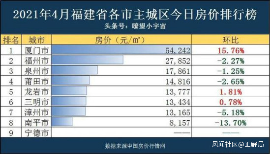 2021年4月福建各市主城區的均價 數據來源:中國房價行情網