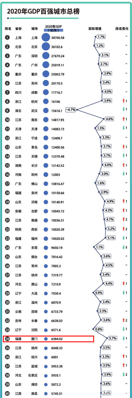 2020年GDP百強城市榜單(節選),廈門排第34位