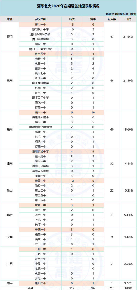 2020年,廈門共有47人被清華北大錄取,佔全省的21.86%,高居福建第一。