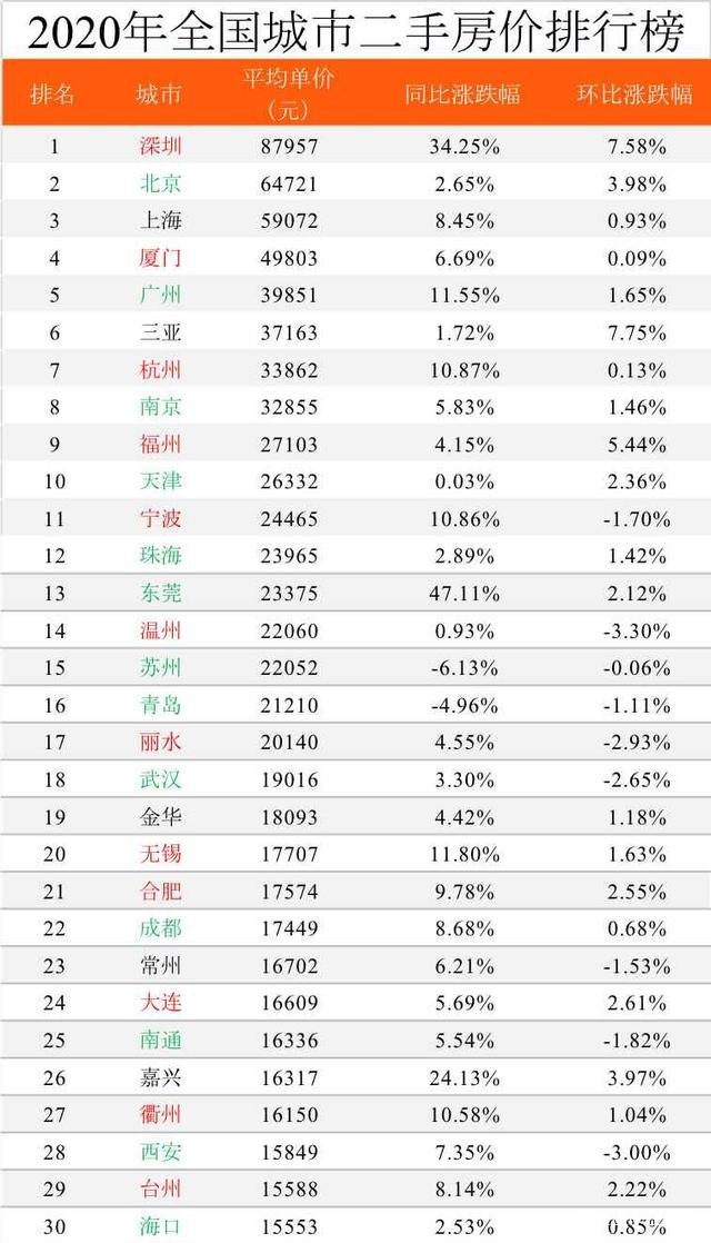 證券時報·數據寶追蹤的《2020年316個城市房價排行榜》數據顯示,深圳高居第一,北京、上海緊隨其後,廈門排名第四,比第五名的廣州整整高出了10000元/平方米。