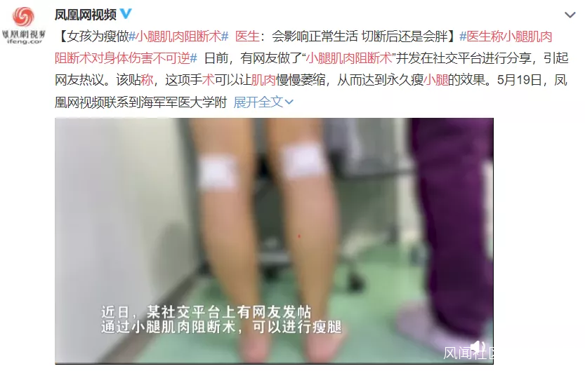 近日,一女孩為瘦做了“小腿肌肉阻斷術”,説是可以讓肌肉慢慢萎縮,達到永久瘦腿的效果。