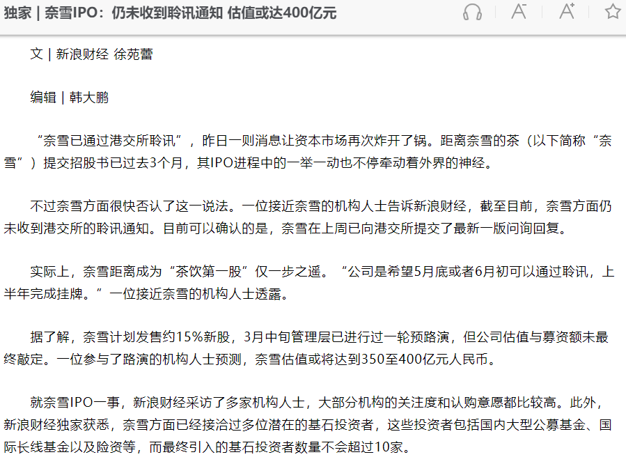 消息人士透露,奈雪希望5月底或者6月初可以通過聆訊,上半年完成掛牌。一位參與了路演的機構人士預測,奈雪估值或將達到350至400億元人民幣。