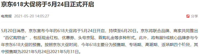 京東宣佈今年的618大促將於5月24日開啓,持續至6月20日。京東將聯合品牌、商家共同推出“百億購物金”,包括現金紅包、優惠券、頭號京貼、首購禮金等多種形式。