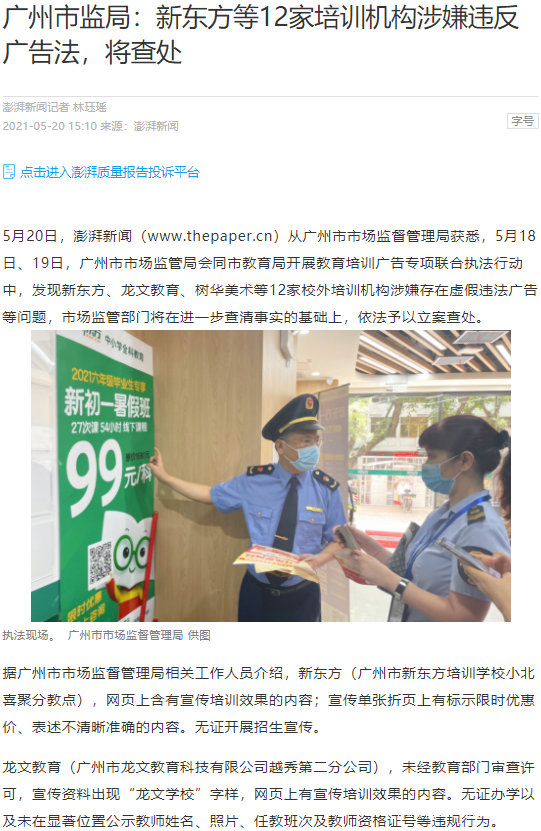 廣州市監局立案查處新東方、龍文教育等12家校外培訓機構,涉嫌存在虛假違法廣告等問題。