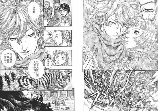 **但實際上,三浦建太郎從少女漫畫中所學到最重要的莫過於對情感的表達。**作為超級硬派的黑暗系漫畫,《劍風傳奇》並沒有沉迷於單純地給予觀眾獵奇、血腥、暴力等感官刺激,而是十分注重人物心理的刻畫及人物關係的多重建構。