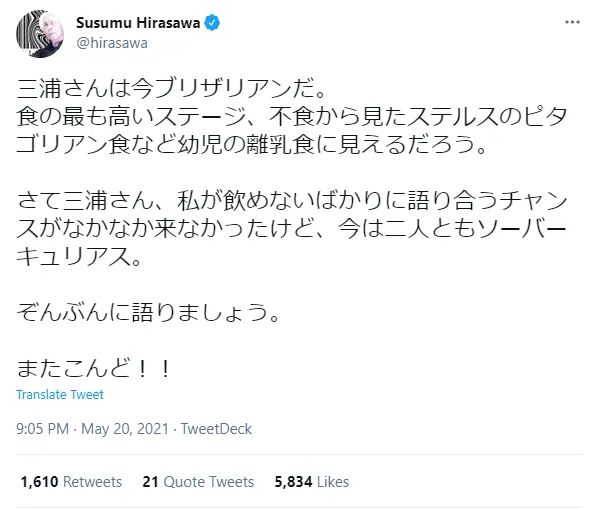 平澤進:因為我不能喝酒所以很少有和你聊天的機會。但今日我們來盡情暢談一番吧。