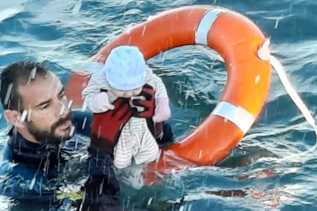 在這些落水的偷渡客中,一名41歲的西班牙國民警衞隊警察胡安·弗朗西斯科·瓦爾(Juan Francisco Valle)從海里救上了一名嬰兒。從圖上看這名嬰兒似乎已經沒有反應了。警察自己説:“我不知道他是活着還是死了,他被凍住了,很冷,沒有反應。”據西班牙媒體説法,這個2個月大的嬰兒被救起後健康無礙。