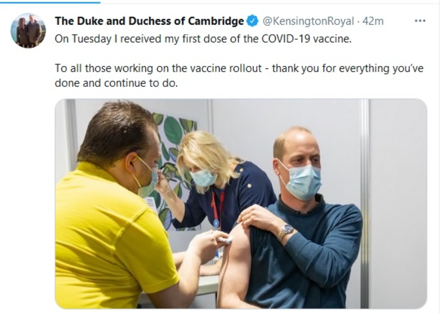 英國王室成員不少已經接種疫苗,包括現年95歲的女王。尚不清楚王子的妻子凱特王妃是否接種。