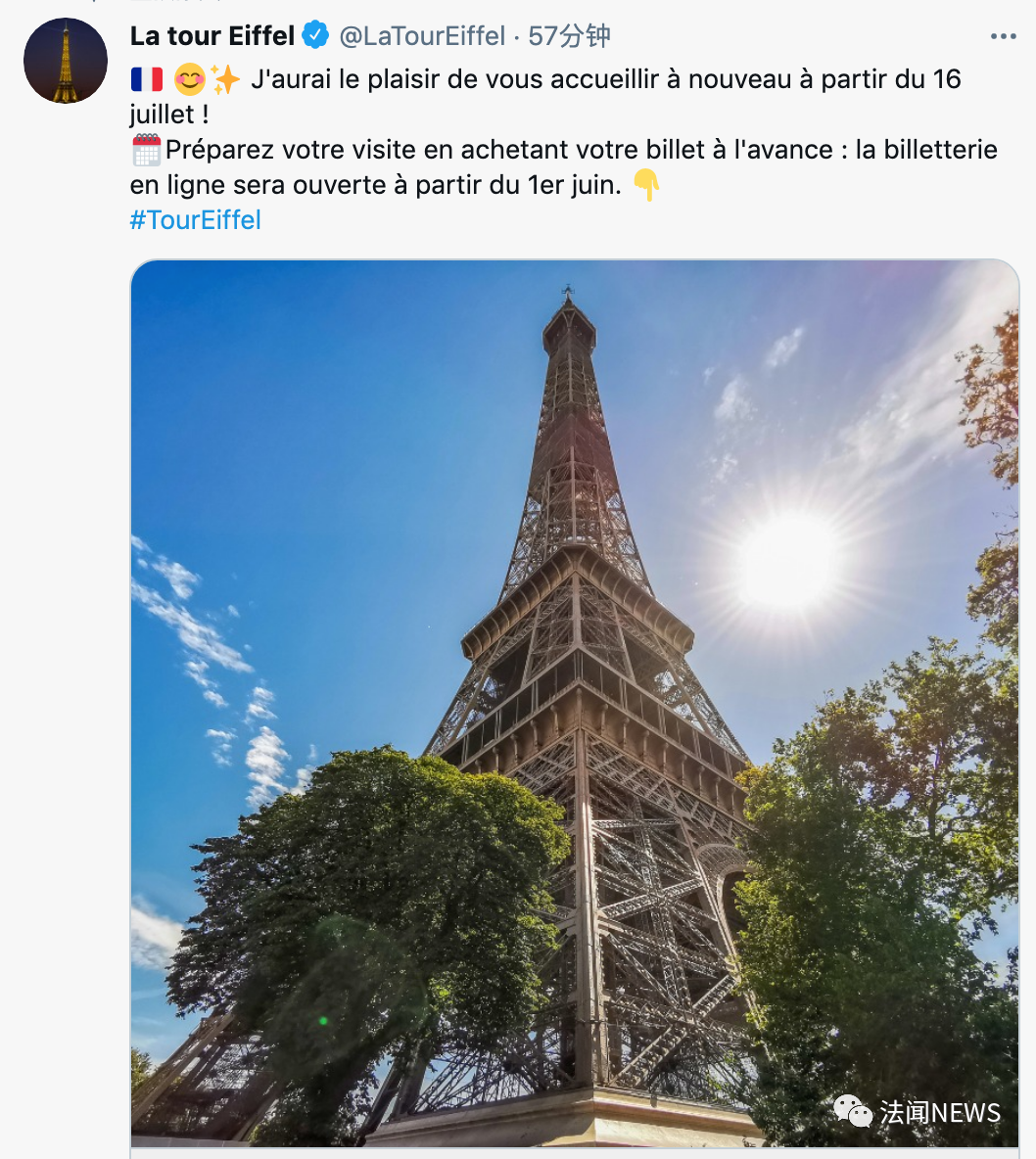 在關閉了將近9個月後,埃菲爾鐵塔官方宣佈:將於7月16日重新開放,官網門票預定將於6月1日開放。