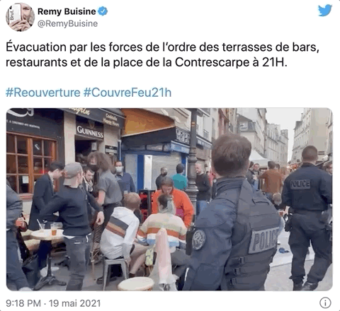 昨日解封首日宵禁推遲到21H,但是有許多人違反宵禁時間**。警察不得不出面干預。馬賽警察甚至開出罰單,在雷恩,警察放出了催淚瓦斯。巴黎露台上的人羣也很密集。**
