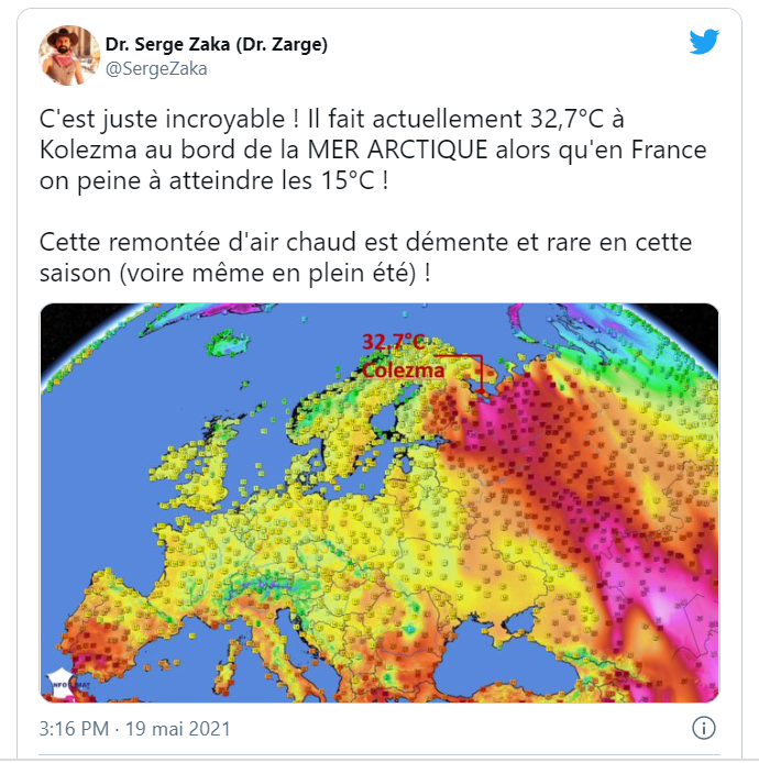 星期三,北極圈以北超過30°C,在俄羅斯西北部和北冰洋邊緣的Kolezma温度達到32.7°C。