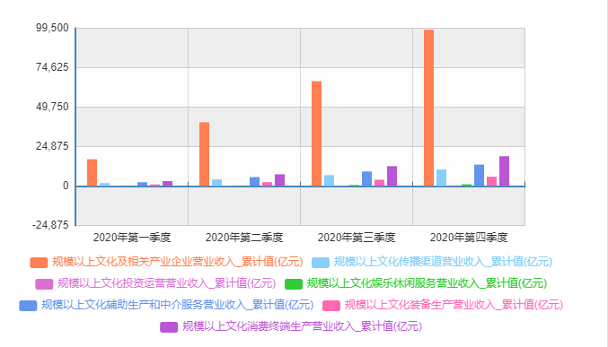 根據國家統計局2020年四季度數據顯示,無論是文化及相關產業企業營業收入還是文化傳播渠道、投資運營、文化休閒服務、文化輔助生產和中介、文化裝備生產、文化消費終端生產等文化領域的各個環節,營業收入都有了明顯增長。