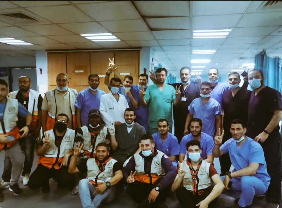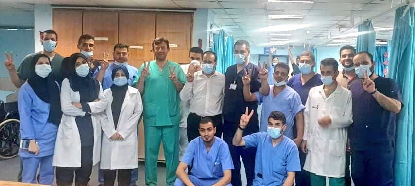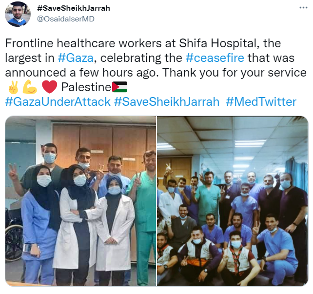 在美國進修的巴勒斯坦醫生@OsaidalserMD 第一時間在推特發佈了這些照片。他稱,敍法醫院的一線醫護們正在為幾小時前達成的停火協議慶祝,感謝這些堅守在一線的同行們。