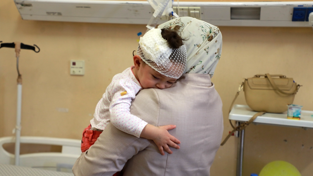 5月16日,敍法醫院,一名巴勒斯坦母親抱着在夜間空襲中受傷的女兒接受治療
