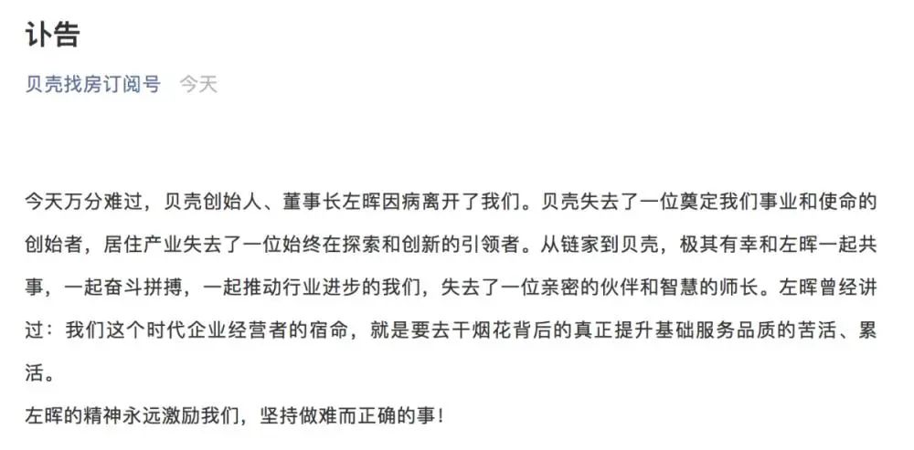 5月20日下午,貝殼找房發佈訃告,公佈了這個消息。貝殼公司上下,一片悲痛。公司裏,所有紅色的元素都被遮上了。