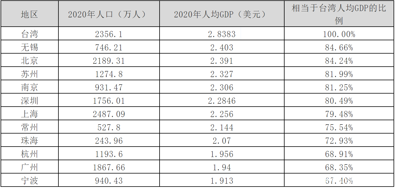 本來一直被認為人均GDP已超過台灣的深圳,無錫,蘇州三市,在第七次人口普查後由於人口大增,人均GDP又全部被台灣超過。