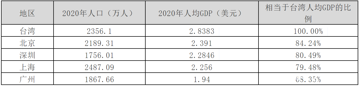 我簡單的做了個表格,如下所示,可以看到北京人均GDP是台灣的84.2%,深圳是台灣的80.5%,上海是台灣的79.5%,廣州是台灣的68.4%
