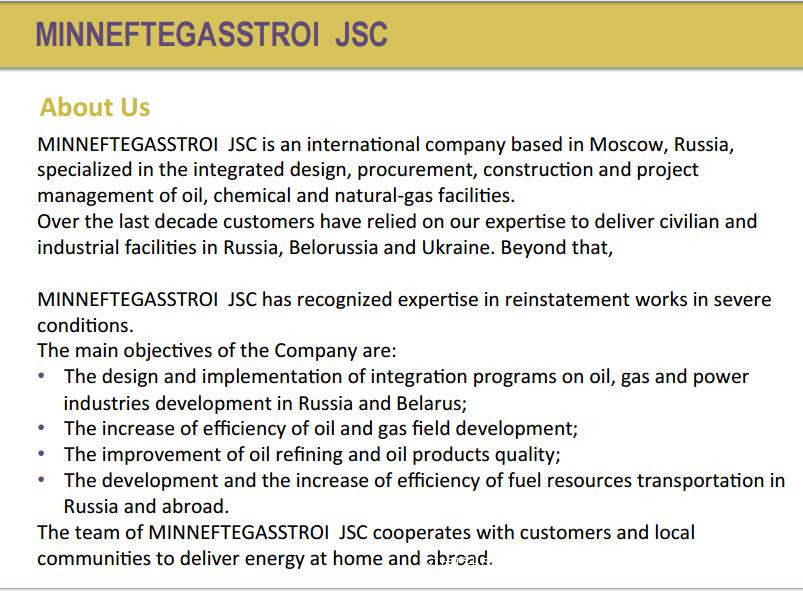 簡介:俄羅斯“MINNEFTEGASSTPOI公司”為國際一體化油氣工程公司。1991年前為蘇聯石油天然氣工業企業建設部,後轉為股份制公司,是前蘇聯MINNEFTEGASSTROI傳統的繼承者。